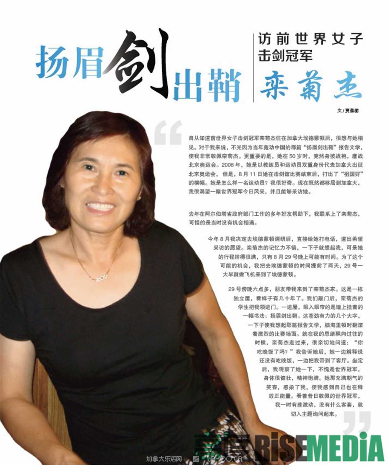 自从知道前世界女子击剑冠军栾菊杰住在加拿大埃德蒙顿后,很想与她相见。对于我来说,不光因为当年轰动中国的那篇“扬眉剑出鞘”报告文学,使我非常敬佩栾菊杰。更重要的是,她在50岁时,竟然身披战袍,鏖战北京奥运会。2008年,她是以教练员和运动员双重身份代表加拿大出征北京奥运会, 但是,8月11日她在击剑馆比赛结束后,打出了“祖国好”的横幅。她是怎么样一名运动员?我很好奇。现在既然都移居到加拿大,我很渴望一睹世界冠军今日风采,并且能够采访她。
