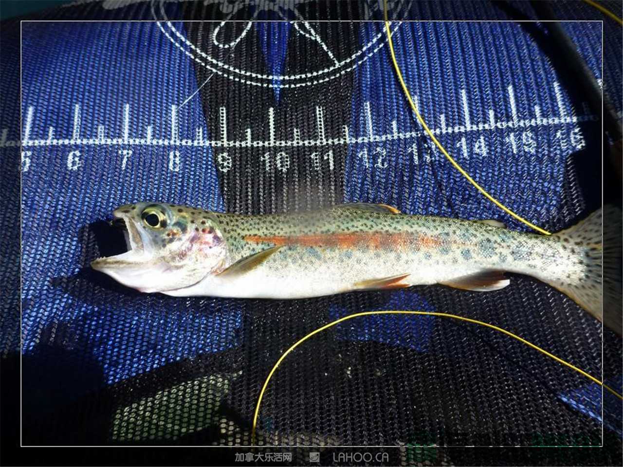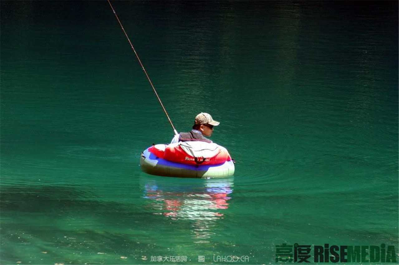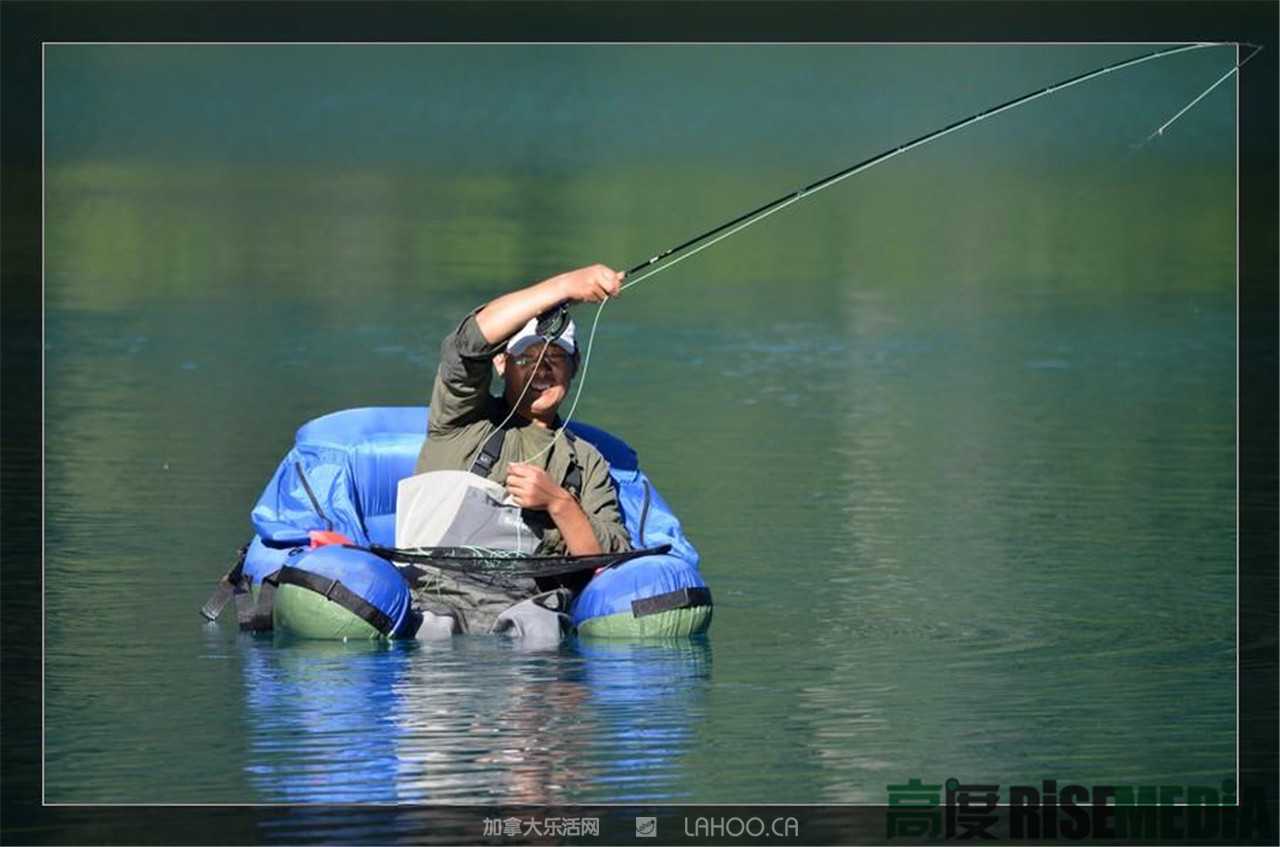 重装备也展开。我们穿上水裤,水沙发充气,带着脚蹼进入清澈冰冷的湖里。追着鱼儿的rising钓,从湖中向岸边隐蔽的灌木附近钓,更换沉水飞钓线往湖水深处钓。飞钓fly fishing,讲究的是渔者和鱼儿的互动。第一,它不同于一般的休闲垂钓,人在不断的走动,飞线在不断的挥舞,逆饵在不断的游动或浮动,是一种“动态”的钓鱼方式。第二,抛投要求的技巧较高,抛投讲究唯美并从不使用真饵比如蚯蚓、虾、面食等,代之以自我制作的精美逼真的昆虫拟饵,其中的艺术成分比较浓厚;第三,飞钓运动和飞钓手,大都以Catch&Release为荣,也就是钓到的鱼儿,小心的留下照片作纪念,然后放归。着重意境和过程,不在乎收获,这也是对自然的一种尊重和保护。话又说回来,传统边走边舞边钓、负重远距离徒步的方式,如果身上再加一串沉重的死鱼,既大煞风景,又不堪负荷,不是吗?