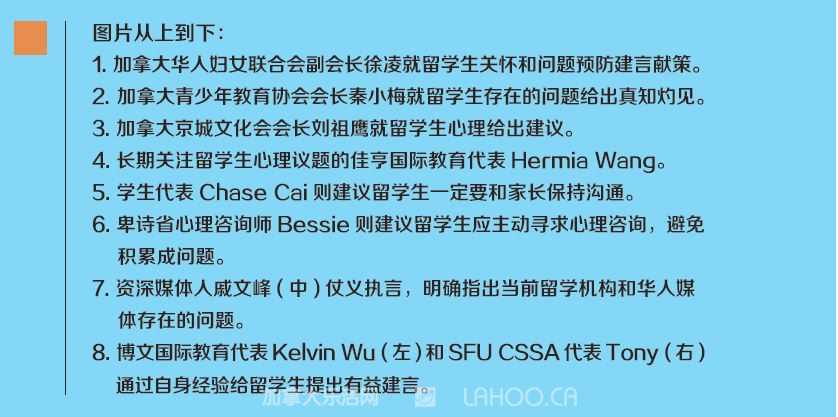事实上座谈会上的访谈只是一小步,而未来的任务任重道远,最后特此感谢卑诗省日托事务厅长陈苇蓁,本拿比市议员和代市长王白进,列治文市学务委员黄秀玲,加拿大青少年教育协会会长秦小梅,加拿大齐鲁华人总商会副会长韩长福,加拿大华人社团联席会主席王典奇及代表刘书梅,卑诗省知名律师孙紫涵,新时代电视台新闻总监叶一滔,宸宇国际文化代表Eileen Chen,CSAA义工组织创办者Jameson Guo,安心义工团义工Steven Li,加拿大留学播报代表郑彪,UBC CSSA代表Gary,本地留学生陪读家长代表,中国心理协会儿童心理健康导师周斌,加拿大京城文化会会长刘祖鹰,卑诗省心理咨询师Bessie,资深媒体人戚文峰,佳亨国际教育代表Hermia Wang,加拿大华人妇女联合会副会长徐凌,学生代表Chase Cai,SFU CSSA代表Tony和博文国际教育代表Kelvin Wu对留学生的建言献策,相信留学生的留学生涯会变得更加美好。