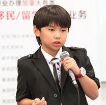 大泉,Maxwell Holmes, 11岁, 高个子的加拿大男孩,就读素里基督教学校,兴趣特长包括阅读,写作,历史,政治,戏剧,脱口秀,有钢琴小王子之称。此外还擅长古典,爵士,摇滚,是UBC夏季音乐学院最小的爵士乐钢琴手,经常活跃在音乐酒吧和艺术舞台上。这个活动激发了他写作演讲的兴趣,他想用纯朴少年的热情,传递温暖的能量,这是他参赛的初衷。