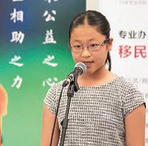 今年11岁的Emma Wei是个性格活泼开朗,善于交友,喜欢唱歌弹琴,热爱一切户外运动的女孩子。她从小就梦想着自己长大后能够成为一个对社区,乃至对国家有贡献的人。而参加这次演讲比赛恰好给予Emma这样一个展现自我的平台,从而让更多人认识与了解她的抱负和梦想。