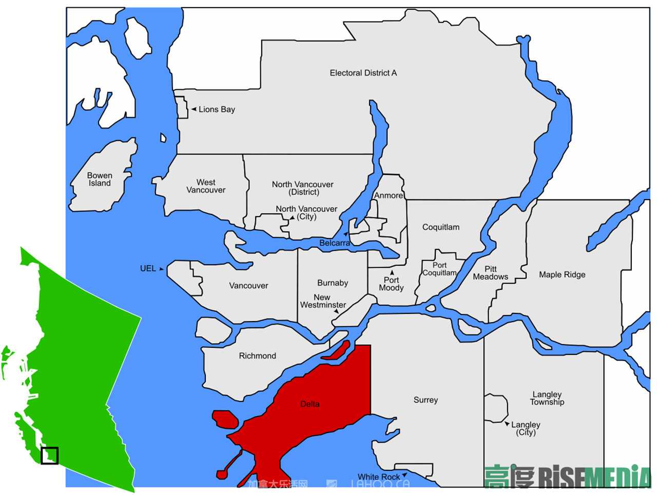 三角洲(Delta)位于大温温哥华市以南27公里处,距离和平门美加边境有22公里,三面环水,北部隔菲沙河与列治文和新西敏相望,西面菲沙河河流汇入乔治亚海峡,南部靠近边境湾,与美国华盛顿州罗伯茨角为邻,东部则接壤素里。三角洲占地面积为364平方公里,是大温面积最大的一处城市,也是大温土地最肥沃和最适合农业耕种的地方。