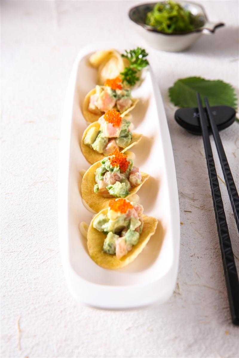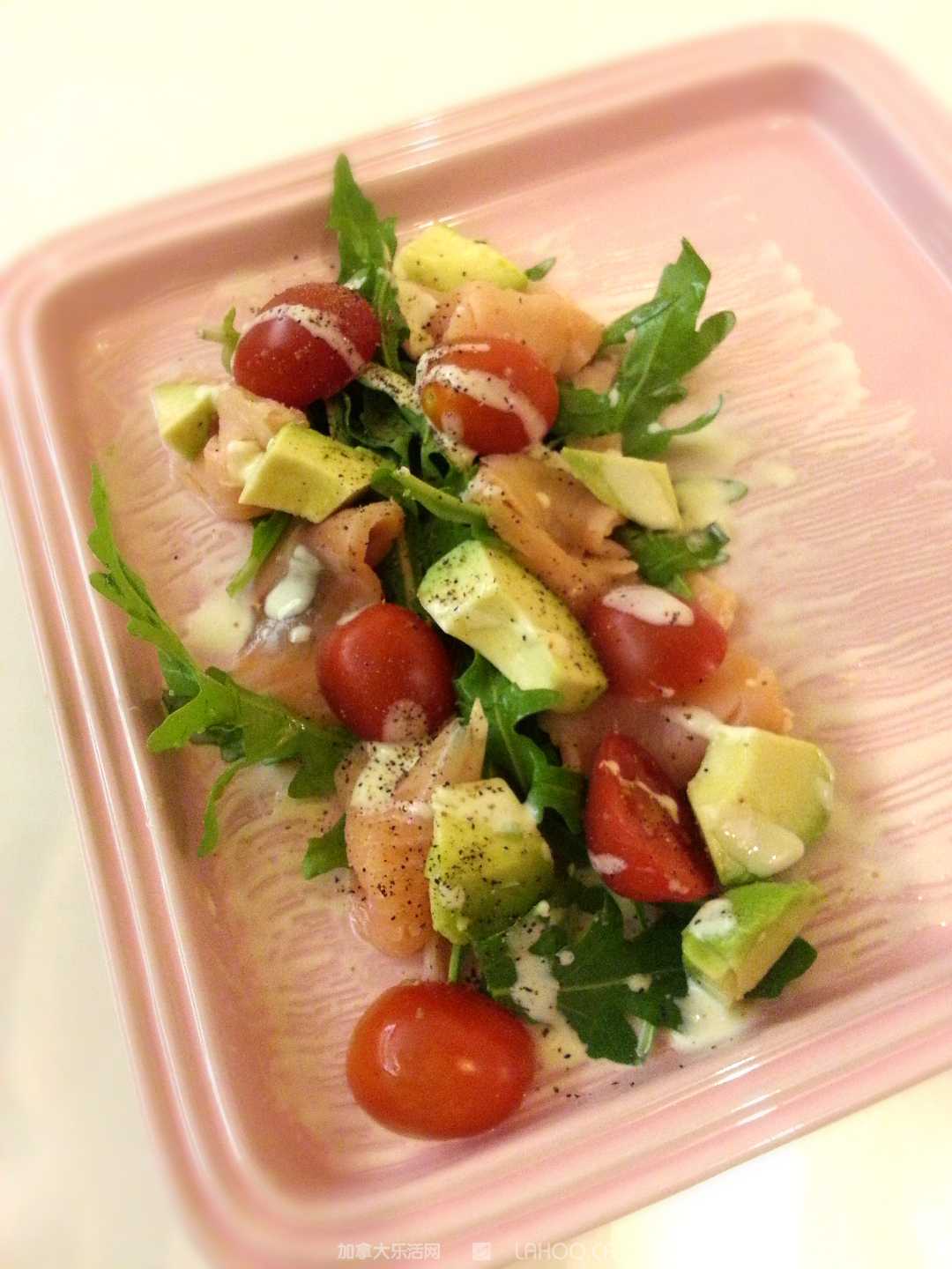 牛油果,又名油梨,鳄梨、酷梨、奶油果,是一种热带亚热带水果,有森林黄油美称,因其果实含油量高,切开后就像牛油一样细腻,很滑软,很绵密,故称之为牛油果,吉尼斯世界纪录甚至把牛油果评为最有营养的水果。三文鱼则最合适生吃,生吃的营养价值最高,因此搭配牛油果是沙拉的黄金组合。