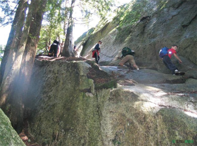 仔细看,岩壁上有一个个铁质扶手和阶梯,握好扶手,踩稳阶梯,固定好腰间的保护链,像蜘蛛侠一样一步步的向上攀爬,在峭壁间把湖光山色尽收眼底,没点胆量还真玩不了这个。这种攀爬的难度系数并不像攀岩那么高,不过并不简单,想玩的话来Squamish就行啦!在海天缆车公共小屋的尽头便有一处难度系数很低铁索栈道,适合成人以及儿童,攀爬时间只需要1.5个小时哦!要不要去尝试一下?