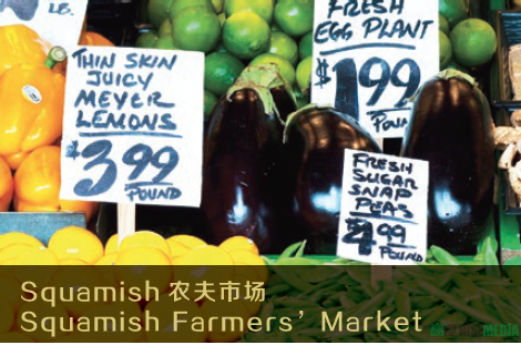 漂亮的农场人见人爱,Squamish农夫市场曾被《温哥华太阳报》评为“卑诗省最好的农夫市场”,这里是Squamish本地人周六必去的地方,超过60家商户在这里出售本地的食品和蔬菜。夏天时开在Cleveland和Victoria,开业时间为5月到9月的星期六,上午10点到下午3点。冬季时开业地点则搬到Squamish小学附近(38370 Buckley Avenue)。