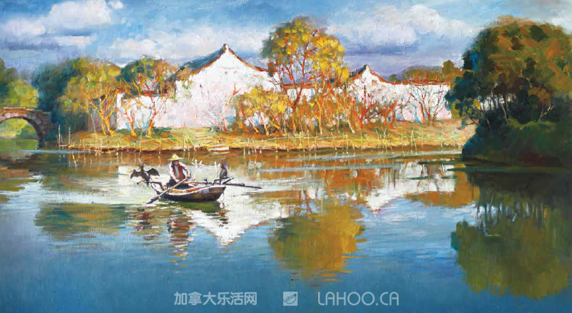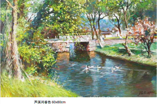 二、诗意江南:起自上世纪八十年代中期,延伸至作为第三阶段的新世纪。该时期作品集中表现江南风情——乡村、水乡诗意之美。艺术上突出特征是作品意境突出,或静谧幽深,或恬淡明丽,田园牧歌式画面犹如人间仙境,令人神往,可以让人强烈感觉到江南诗意之美和作品抒情性。“诗意江南”系列是这一时期代表作品,此外《水巷深深》,《渔篓》,《江南雪霁》,《悠悠故乡情》,《青青河边草》,《彩霞满天》,《运河人家》,《芦塘清趣》等也都比较典型。