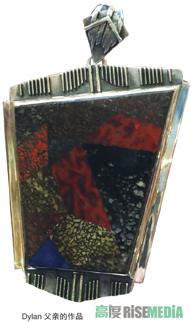 Dylan向我展示了一件他父亲的作品——一大块项链坠子,在半个巴掌大的不规则四边形坠面上,竟然出现超过十个几何形色块,色彩斑斓跳跃,令人怀疑那是一块拼贴图案,而它的确就是一块石头的剖面,可见那一刀有多么精准!如果不是对宝石的物理化学构成了然于胸,齿轮不可逆转地切割过去,很可能锯出一地支离破碎的惋惜,唯有高手才能捕捉到这斑斓璀璨的一幕!