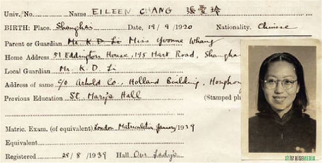 张爱玲1939年进入香港大学就读时,学籍登记资料。