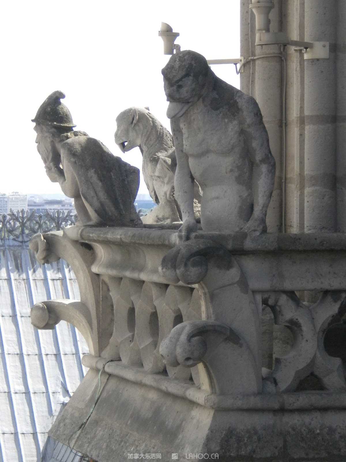 石像鬼(Gargoyles)是一种神话中的鬼怪雕刻,通常用于教堂建筑当中,除了起到美学景观效果和宗教内涵以外,还兼具排水管和排水孔功效。而石像鬼究竟起源于何方神圣,一般说法为牧师圣罗曼努斯(St Romanus )用十字架征服石像鬼后,将其带回鲁昂焚烧,除了头部和颈部外均接受烈焰的考验,然后把它安装在教堂墙壁上,以达到以鬼驱鬼的目的。而巴黎圣母院的石像鬼始建于十三世纪,数量达上百个居多,姿态各异,成为一道靓丽的风景线。