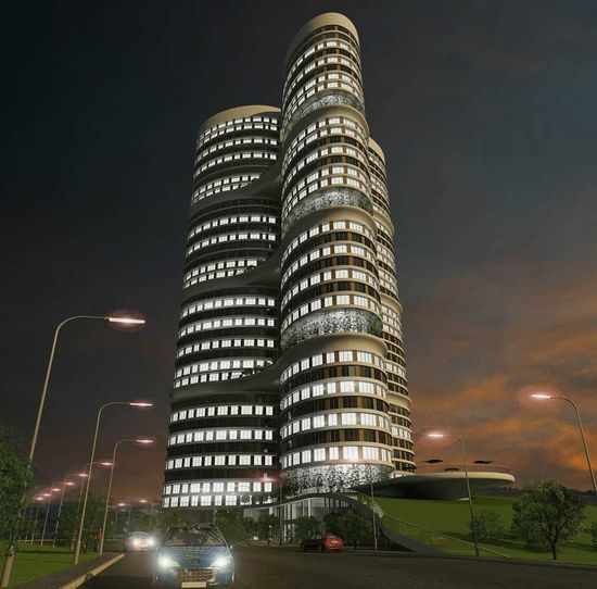 由北京MAD建筑事务所建筑师马岩松所设计,Fernbrook和Cityzen联合开发的梦露双塔分别高179.5公尺(56层) 、161.2公尺(50层) ,两栋大楼自底层的-10度开始向上旋转,每层楼最高转度为8度,整栋大楼共旋转209度;如此转度已经达到建筑技术上的不凡成就,同时更改变了以往高层摩天大楼的建筑定律,因此而夺冠。在此之前,芝加哥的高层建筑与城市人居委员会(Council on Tall Building and Urban Habitat) 于去年6月13日,也将[终极双子塔楼]评选为北美最佳高楼。