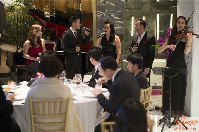 在“圆梦金夜”私宴的高潮部分——晚宴环节,社交成为在场贵宾的主要活动。本次晚宴特别邀请了曾在2010年温哥华冬奥会会上有着精彩的演出的温哥华著名美声合唱乐团Vivace以及荣获国际魔术师大赛冠军的Jason到场助阵。魔术师Jason用其技艺精湛的近景魔术为现场嘉宾们带了一番震撼的视觉享受,Vivace乐团天籁般的合音演唱更是陶醉了在场所有嘉宾,将全场气氛推向高潮。