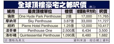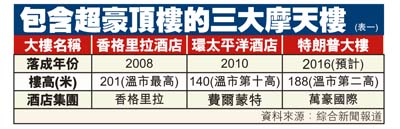 这些包含超豪顶楼的大厦,都是近年流行、下方为酒店而上方为豪华住宅单位的大楼模式。由万豪国际(Marriott International)集团经营其中酒店的特朗普大楼,顶层单位估计将与香格里拉酒店和环太平洋酒店的顶楼,鼎足而三,成为这类超豪地产项目的典型指标(见附表一)。这种从顶层单位售卖方式及接手买家去观察的地产资讯,多少可窥视出一地房市风向所在,极具参考价值。