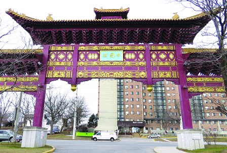密西沙加中国城的巨大传统中华门。(明报记者摄)