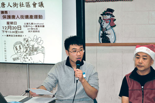 此次社区会议由加丽基社区行动计划(Carnegie Community Action Project)属下的唐人街关注组发起。约有30人参加,多数是来自华埠的长者。发言人陈敬望表示,发展商在华埠的发展计划中,最受关注的是位于华埠纪念碑旁边的土地,发展商正申请兴建高层商业柏文,若获得批准,恐怕会影响华埠社区特色。
