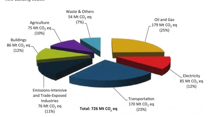 (按部门分列的温室气体排放量,在2013年建筑物排放量直接占全国排放量的12%,即二氧化碳当量排放量的86兆吨。来源 Environment Canada National Inventory Report)
