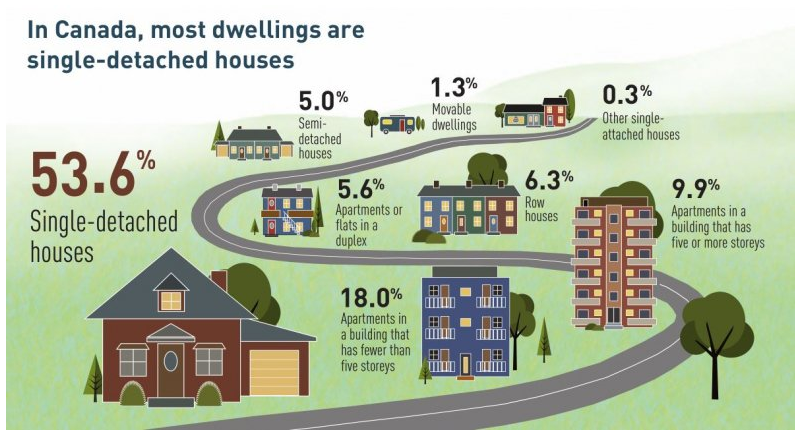 加拿大统计局的人口普查数据显示,独立屋不光是传统加拿大中产阶级家庭生活的象征,也是许多人渴望的梦想之家。“然而房价上涨、通勤成本和人口老龄化的压力,成为导致加拿大人选择购买多户型住宅的三个主因。”全国1,410万住宅单位中有750万个独立屋单位,但自1980年代初以来独立屋数量一直呈下降趋势。而在加拿大魁北克省和不列颠哥伦比亚省中,独立屋类型的住宅数量已经不及其他住宅类型的50%。