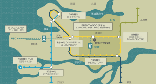 Brentwood 社区离温哥华距离只有不到2公里,学校商业配套齐全、环境优美、交通便利,公交和天车可以很方便到达市中心、北温哥华、Metrotown铁道镇、BICT、SFU校园。最重要的是,从Brentwood出发,不管是去温哥华、西温北温,还是高桂林、列治文,都只要半个小时的车程!