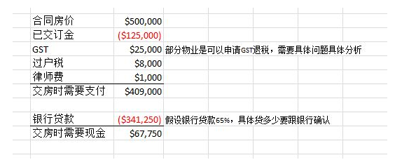 购买楼花,除了要提前安排好前期订金之外,在成交的时候需要多少资金,大家也必须要做到心中有数。在BC省成交新房需要交5%的GST,过户税,还有就是律师费。下面我们以一个合同价50万加币,已交订金25%的楼花为例帮大家算算。