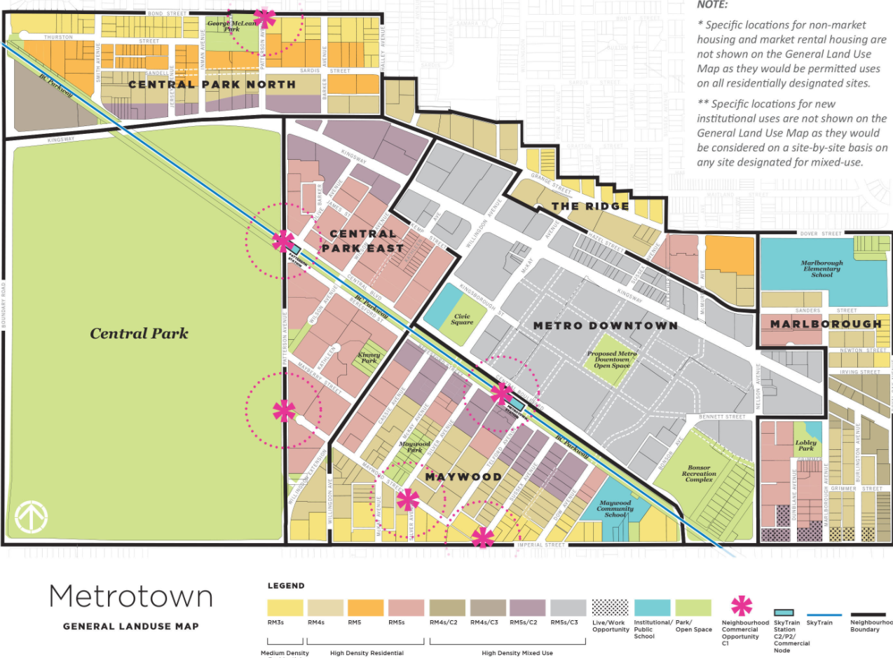 《Metrotown Downtown Plan》 计划将重新打造铁道镇成高密度的舒适城市社区,其中核心区域将打造超高层建筑,为市中心的天际线带来新的风景;高层公寓楼及写字楼的底层将被设计为串联起来的公共领域,如街道、广场、公园,对公众开放休闲;改造的区域包括Metropolis购物中心、Maywood、Central Park East多个地块。