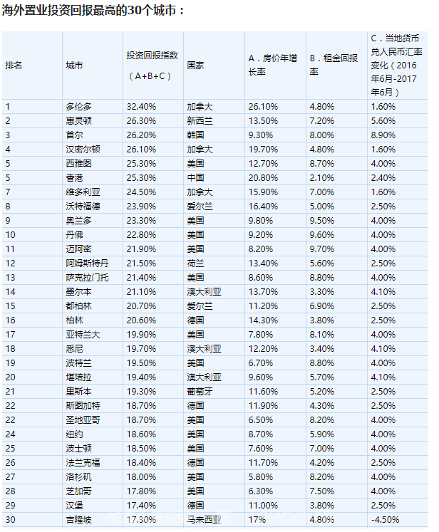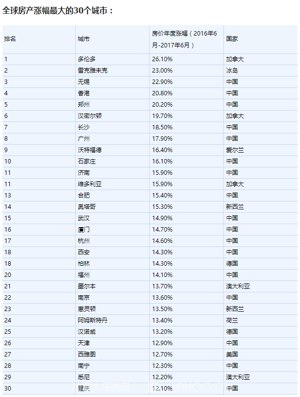 从各大城市房产涨幅率来看,加拿大的多伦多毫不意外的当选上半年海外置业投资回报率最高的城市;其次是新西兰的惠灵顿,排名第三是韩国的首尔。该榜单中入选城市最多的国家仍是中国,其中无锡成为大陆房价年增幅最高的城市;而加拿大的多伦多、汉密尔顿、维多利亚和温哥华则也成功闯入榜单。