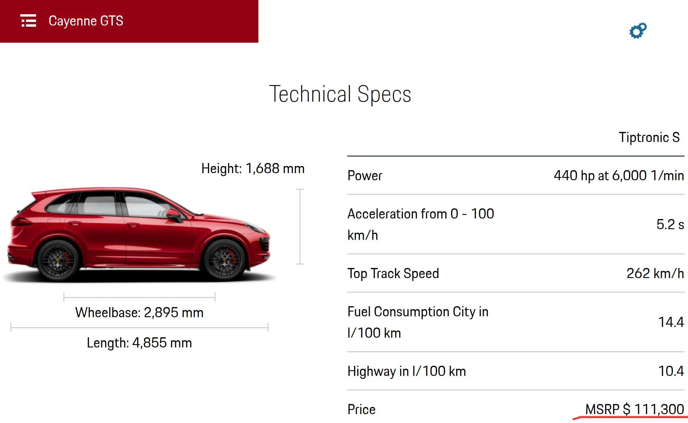 每平米快100万的牌照拿到手,总不能看太寒碜的车啊,保时捷卡宴GTS吧。到上海4S一问,税后180万人民币。温哥华同款税后约合86万人民币。