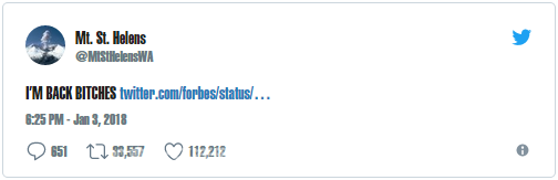 温哥华时间2017年1月9日,美国历史上最致命的火山爆发源头 – 圣海伦火山(St. Helens Volcano,位于温哥华以南仅500公里)在Twitter上乐呵呵地宣布“我胡汉三又回来啦!”。据美国地质调查局记录显示,去年圣海伦火山附近至少有89次地震,其中最大的一次地震是3.9级地震。