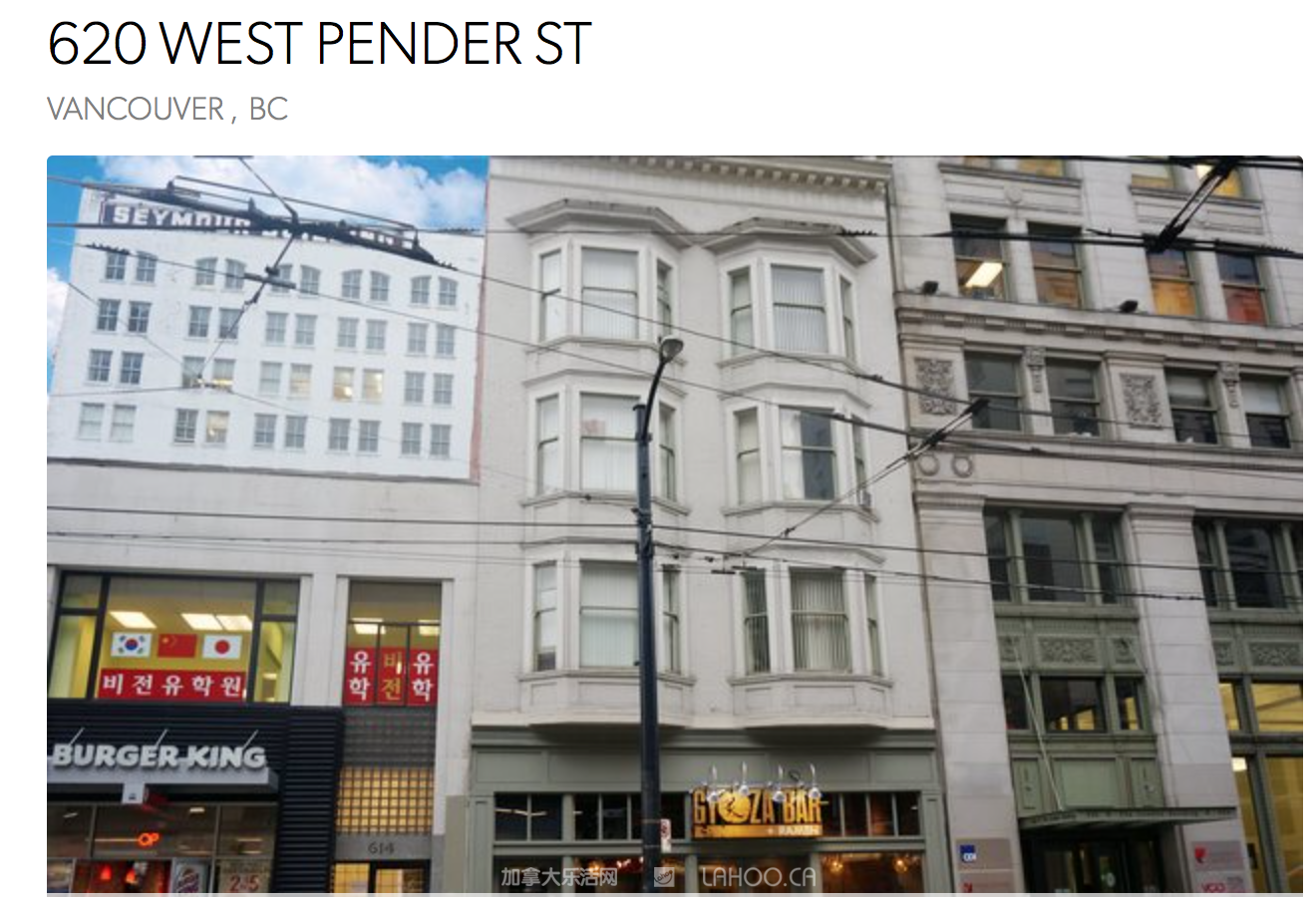 小编则在网上查到,620 W Pender St的建筑在1906年建造,并于2011年重新改建。建筑全部采用木结构,并有砖结构地下室。总建筑面积估计为15,600平方英尺(包括出租给零售租户的地下室),上面三层有51个微型套房。每个单位都设有经过修整的硬木地板和高效的布局。
