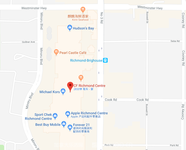这些公寓楼就毗邻列治文中心商场,由Cook Rd沿着No.3 Rd开始,像马蹄一样围绕着整个商场的南端。届时,Park Road将会延伸至Minoru Boulevard,一些大楼也会向北迁移。