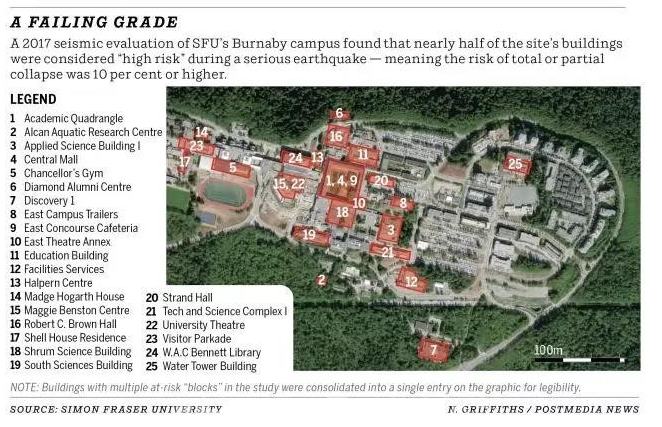 2017年,加拿大工程顾问公司Read Jones Christoffersen对SFU本拿比校区内的70个建筑进行了抗震评估,结果发现居然有34个属于“高危”,意思是如果发生”中度严重”的地震,这些建筑物倒塌的风险将超过10%,其中包括Bennett图书馆、Shrum科学大楼和Shell House学生宿舍。