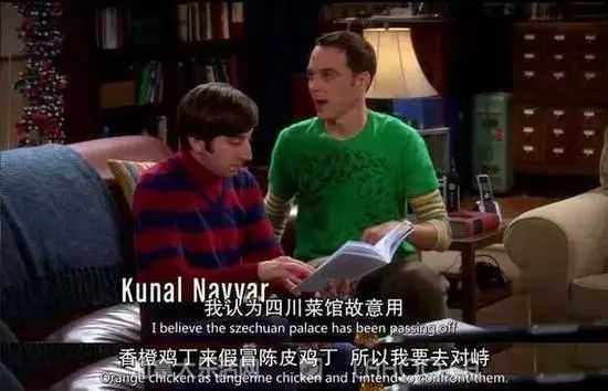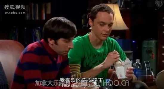 陈皮鸡是Sheldon的最爱,因为曾怀疑四川饭馆的陈皮用料有问题,谢耳朵学霸还特地学了中文,去和中餐馆老板对峙。