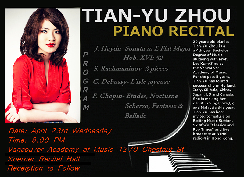 [温哥华乐活网 乐叔综述]4月23日,加拿大著名华裔女钢琴家周天羽(TIAN-YU ZHOU)将在温哥华音乐学院举办个人专场音乐会。这场音乐会之后,周天羽将开展他的亚欧音乐之旅,估计本年度内,温哥华音乐爱好者将很难有机会再聆听她的精湛演绎。