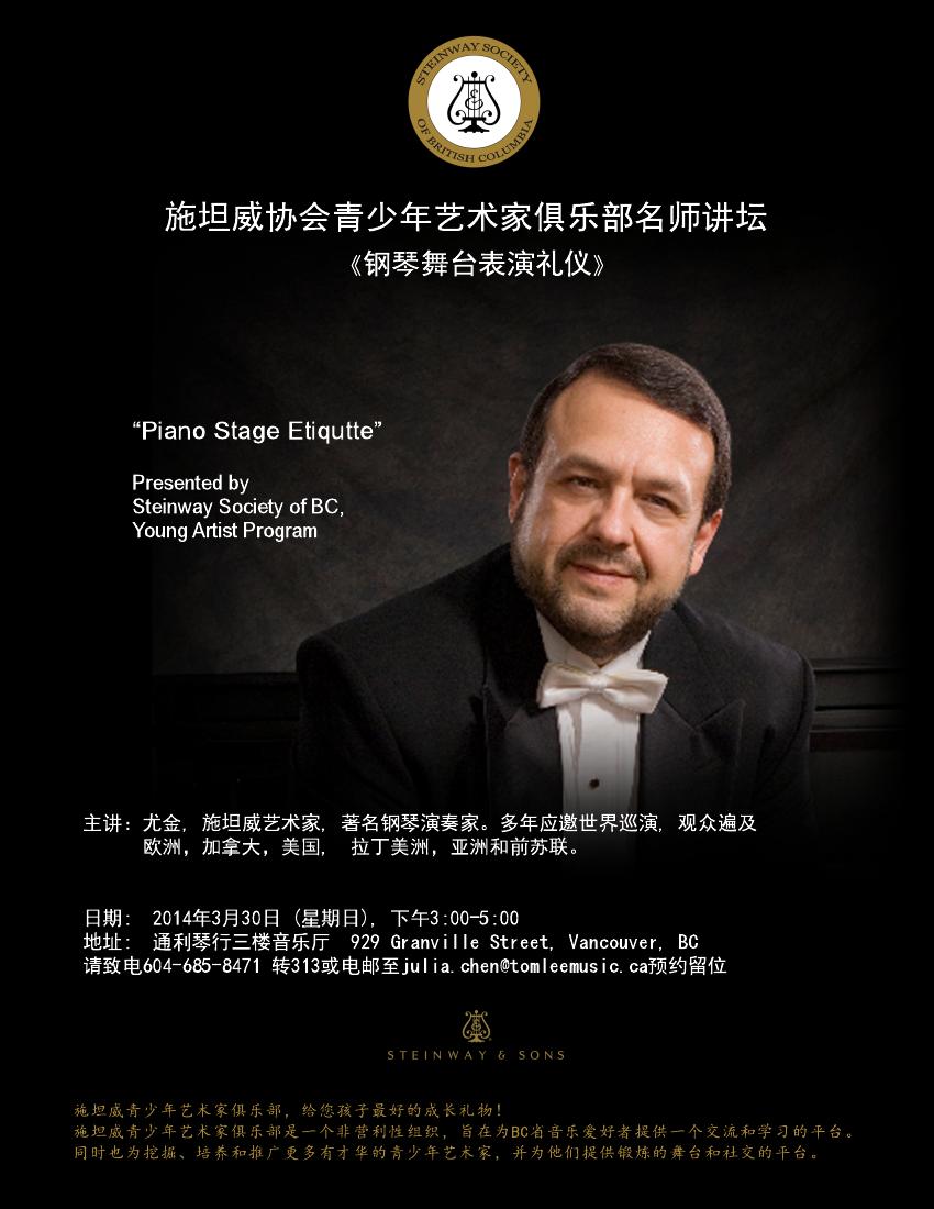 [温哥华乐活网 lizzy报道]3月30日施坦威青少年艺术家俱乐部将特别邀请著名的施坦威艺术家尤金·斯科瓦洛尼可夫为大温钢琴爱好者讲解钢琴舞台表演礼仪,尤金将结合自己的丰富表演经验,向钢琴受好者介绍如何在钢琴演奏中将礼仪与音乐融为一体,提升音乐表现力,为听众带来更多的视觉与听觉的双重享受。这将是大温地区钢琴爱好者一次难得的聆听大师经验的机会。