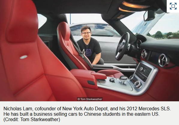 报导访问「纽约百车汇」(New York Auto Depot)创始人来自中国香港的Nicholas Lam说,他的创业源动力是来自中国大陆留学生。他自2012年进伊利诺伊大学读书,一开始他象很多人一样认为美国文化吗就是“一辆大车”,但是当他遇到一群开着超跑的来自中国大陆的学生后就改观了,他们对豪车的渴望从副驾驶座位上毫无掩盖地流出。现在,「纽约百车汇」客户95%都为中国留学生,其全职员工8名,并在东岸各大学的散步了54位豪车推销员。他透露,百车汇每月平均售出一辆近20万元的蓝宝坚尼Huracan跑车,而单价10万元以上的豪车,也占每月车行业绩两成。