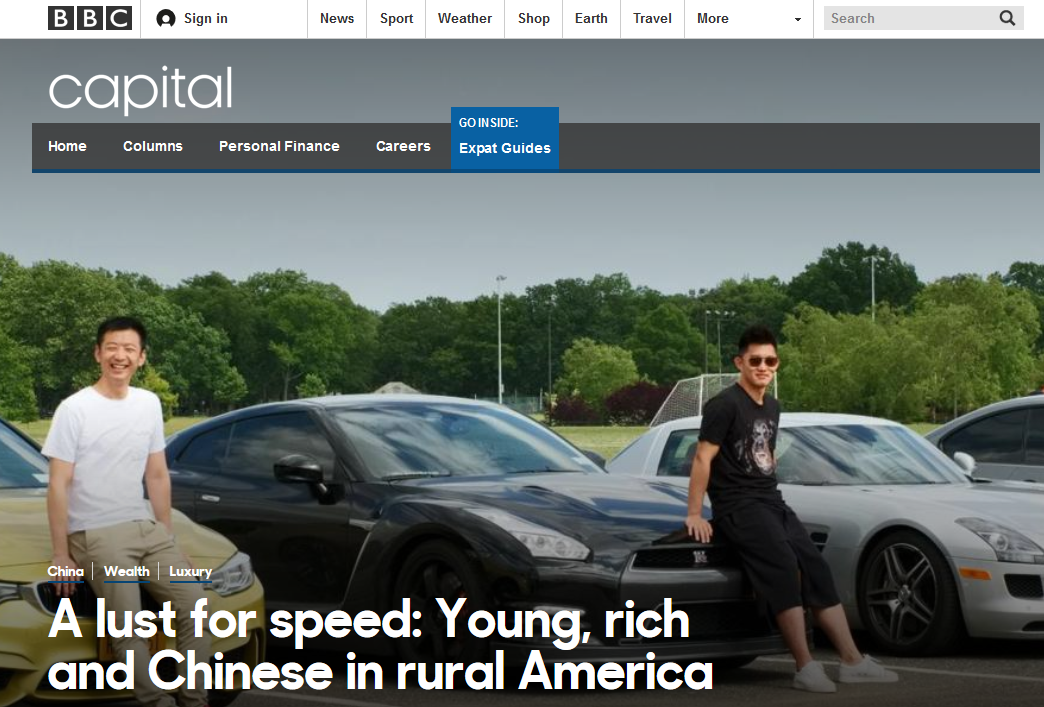 BBC在2016年6月7日以「速度欲望:美国郊区年轻有钱的中国学生」(A lust for speed:Young, rich and Chinese in rural America)来报导在美国中西部大学就读的中国留学生,和他们的豪车「梦想」。