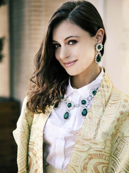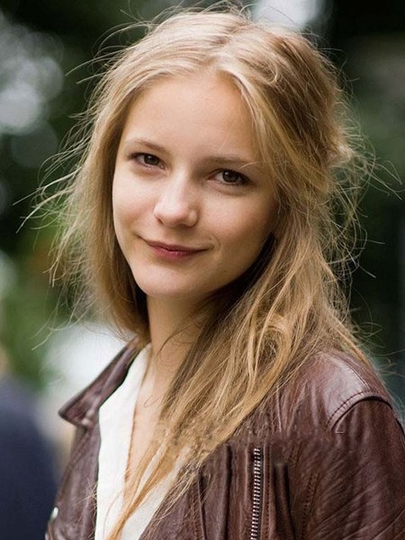 亚麻的亮色长发,半盘着,中分的柔美长发经典造型,前额的全露是美丽的魅力。