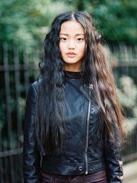 长长的及腰波浪墨黑散发,再以中分将女性骨子里的天性温柔呈现。
