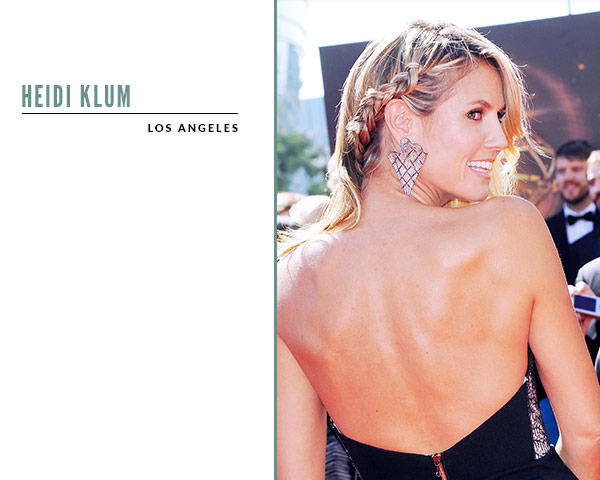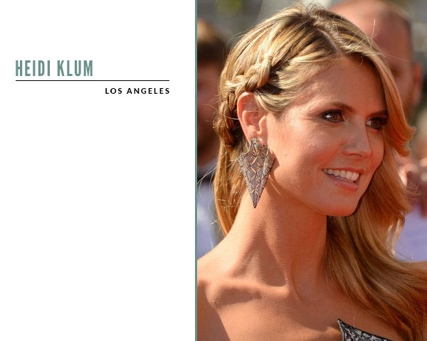 发型师Andy Lecompte给模特Klum编了一条紧紧的法式发辫,从一侧延伸到脑后,露出夸张的耳饰。