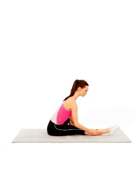 坐姿,右腿伸直置于地板上,左腿弯曲,左脚脚掌紧贴在右大腿内侧,背部撑直,身体微微前倾,右手稳在右小腿外侧,左手稳住左脚,撑直右腿,维持15秒后,可换另一只脚重复做。