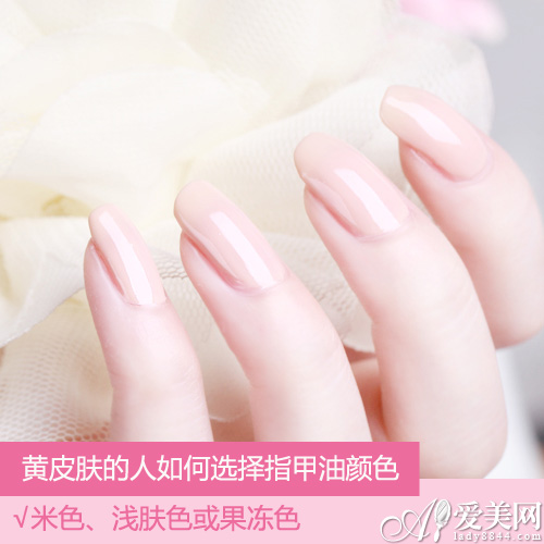 大部分偏黄肤色的人,比较不适合贝壳和珠光质地,因为反光会让指节颜色显脏,太粉红的色彩则会显黄。略具透明感的米色、浅肤色或果冻色属于不挑肤色的万能美甲色。