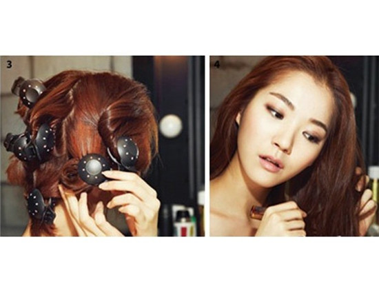 step 1:用卷发棒将发尾往夹,分层将头发弄卷。