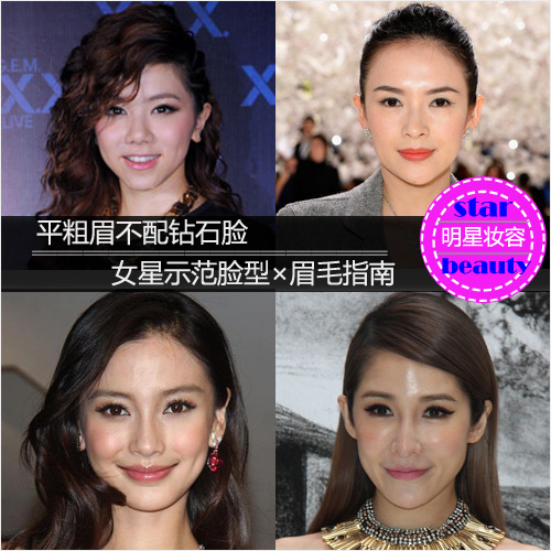 一般脸型分为六种,邓紫棋款的圆脸、容祖儿款的方脸、章子怡款的钻石脸、angelababy款的心形脸、刘亦菲款的椭圆形脸和萧亚轩款的长脸。女星们用最有星味的眉妆教大家如何做满分眉女。