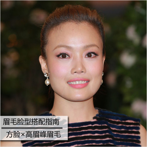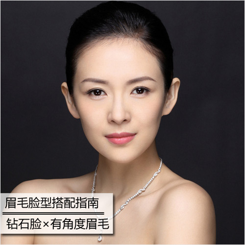 钻石型脸就是额头偏宽,但是面部的下半部分比较小的脸型。像章子怡一样的钻石脸可以利用一些小伎俩让脸看起来更小,有明显眉峰的有角度的眉毛,或者眉峰处有圆润角度的眉毛都能让额头看起来有变窄的效果,让脸型看起来更完美。