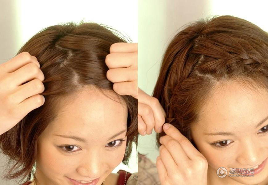 短发编发时一定要注意分缝,尽量避免直直的平分头发,一目了然的头发缝会破坏美感。像这样Z型错开的锯齿形最推荐。分好之后,两边分别进行编发,先取三股头发,开始编发后,在两侧不断续发。在续发的过程中,一定要将发束拧一下再编进去,这样过短的发丝能够藏在发辫内,同时发辫更蓬松立体。