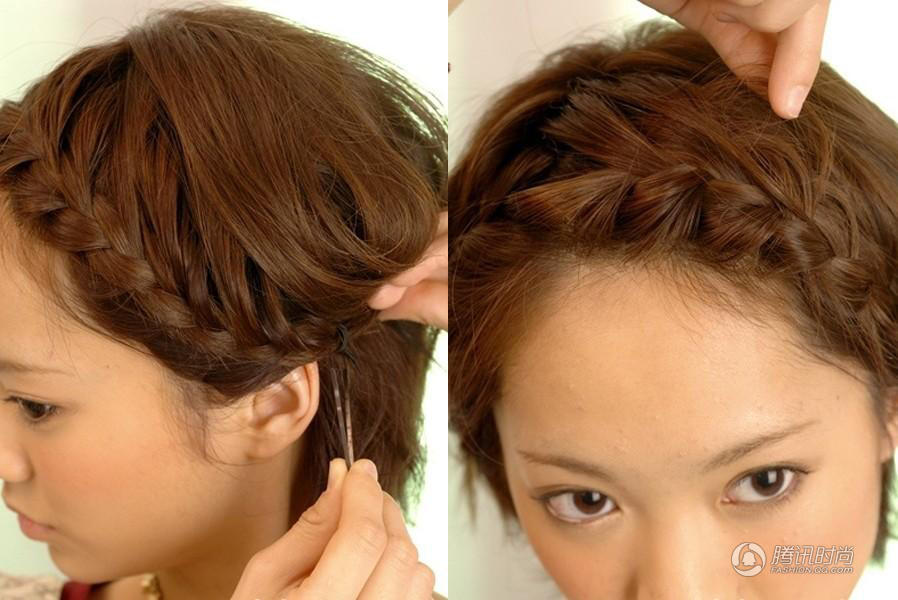 编至耳后位置,将发发辫扎好,用小卡子固定。短发编发切忌发辫紧紧的贴着发根,一定要拉出发丝制造蓬松感,如果怕太过散落可以用发卡固定发梢的位置。