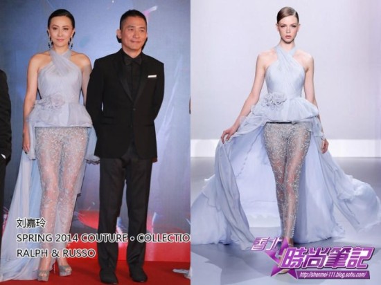 刘嘉玲身着Ralph & Russo2014春夏系列浅天蓝色长裙亮相,这身LOOK上身简约利落,淡紫色也让人醉心,下身完全脱节,也许露得一双美腿也堪比长腿欧巴,但这组合真的太性感了!