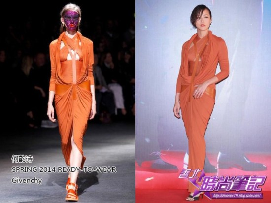 何韵诗身着Givenchy 2014春夏细节暗橘色连身抽褶长裙。一向刚硬中性的她带越发的女人起来,这长裙野性中带着优雅,颜色抢眼又特别, 显高显身材又与众不同。