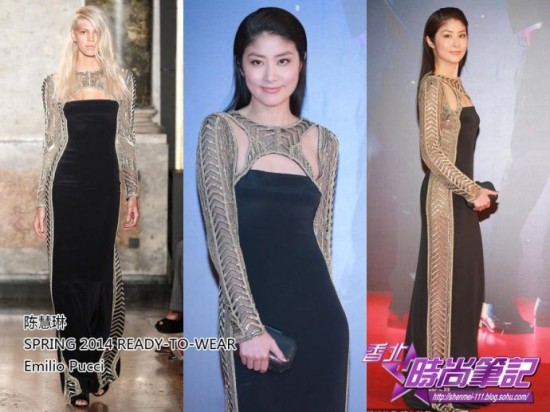陈慧琳身着Emilio Pucci 2014春夏系列拼接修身长裙亮相,真是辣妈好身段,柔中带刚,高挑又显瘦,两侧与肩部的金色镂空透视设计,行走间的性感女人味儿!