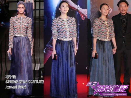 章子怡身着Armani Privé2014春夏高级定制系列夹克与长裙,她和所有的女明星都不同,这身LOOK太简约非华丽,添活力减高贵,上短下长显得比例不错,也许她就想着领完将直接出门豪吃一顿且完全不用换衣服。