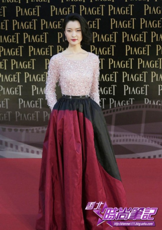 作为超模,杜鹃的转型算是非常成功的,首次触电就入围最佳女配角与新人奖两项大奖。在着装上这身淡粉色珠片上衣配搭酒红色拖地长裙,高挑纤瘦,回眸间优雅动人。