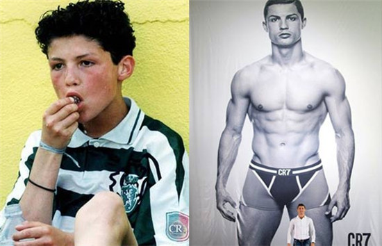 5年后,C罗的身价涨了近千倍。曼联以1224万英镑签下C罗,后来皇马花了9500万欧元才得到他。身价倍增的背后是名气的增长,从那时起,C罗开始脱下“乡村小子”的外壳。